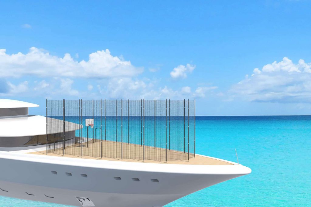 Große Yachten ab 60 Meter Länge besitzen fast immer ein Gym an Bord. Denn wer an Land regelmäßige Sporteinheiten gewohnt ist, möchte auf dem Wasser darauf nicht verzichten. Die Räume werden oft mit drei bis fünf Geräten ausgestattet und befinden sich in 90 Prozent der Fälle auf dem Unterdeck. Sie sind, das muss dabei konstatiert werden, allerdings hauptsächlich für Eigner und Gäste geschaffen, die gern in Innenräumen und an Geräten trainieren und dies gewohnt sind. Anhänger von Ball-Sportarten wie Volleyball, Basketball oder auch Badminton mussten bisher auf Courts in der Nähe des Hafens oder Ankerplatzes ausweichen und die Yacht dafür verlassen.