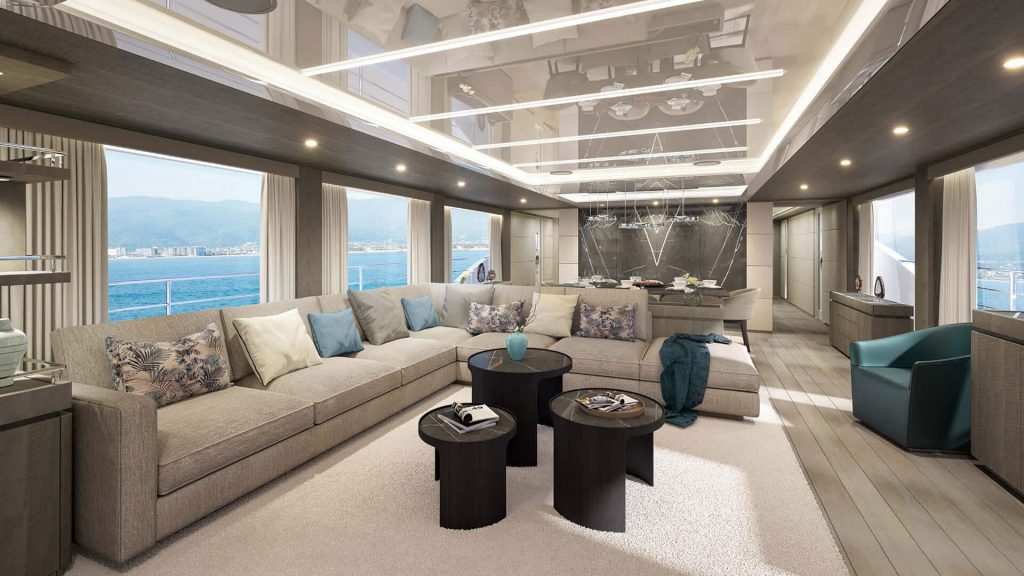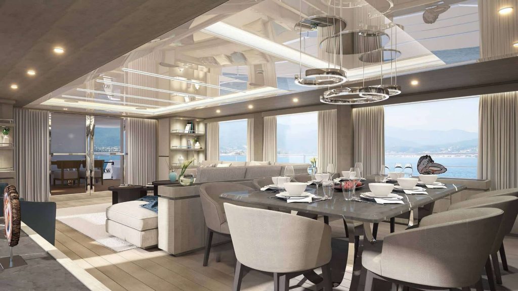 Die Kabinen der äußerst modern gestalteten Yacht zeigen einen ähnlichen Look, wobei der Eigner in einer veritablen Suite samt Office auf dem Hauptdeck nächtigt und die Gäste in vier Kabinen auf dem Unterdeck. Claudia Drettmann freut sich über die Umsetzung des Designs: „Mit dieser Majesty 100 und unseren sehr involvierten Kunden demonstrieren wir wie individuell dieses 32-Meter-Modell werden kann.“ Bereits in der Vergangenheit gestaltete Claudia Drettmann zahlreiche Einrichtungen für verschiedene Marken, insbesondere jedoch für Bandido- und Elegance-Yachten.