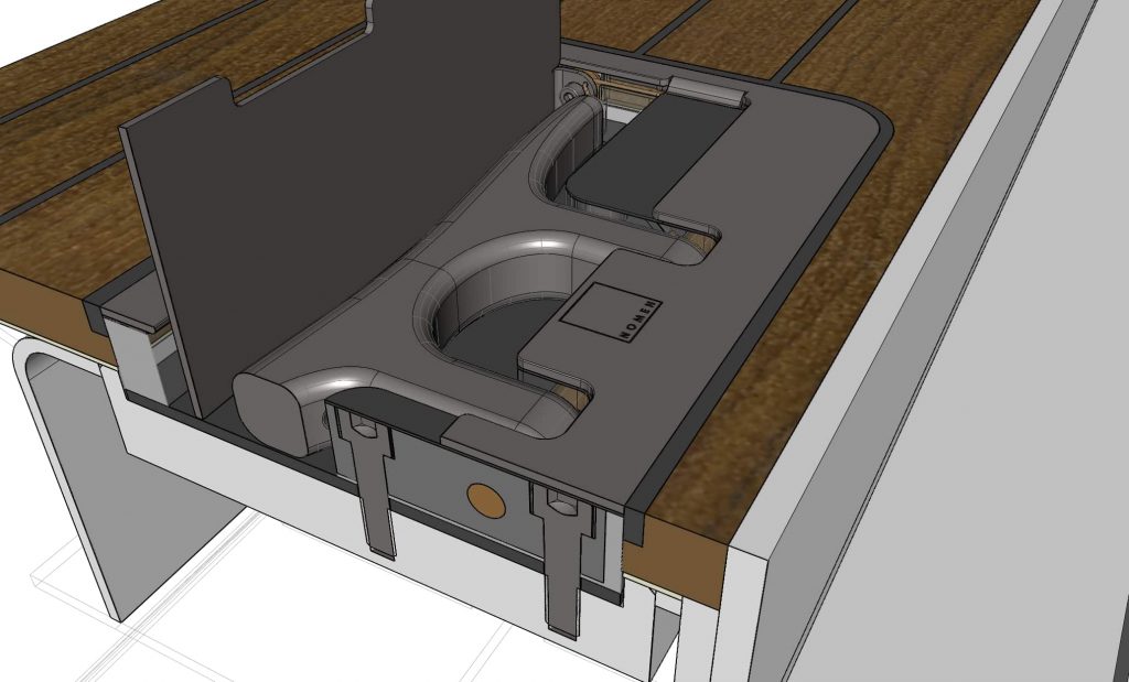 Axel Hoppenhaus, Geschäftsführer bei NOMEN und federführender Designer, hat sich für die neue Plattformklampe ein System ausgedacht, das sich von allen anderen auf dem Markt befindlichen Lösungen unterscheidet. „Die Nomen Klampe IV ist federbelastet und kann nicht durch die Schwerkraft aus ihrer liegenden Position fallen, wenn die Plattform geschwenkt wird“, erklärt Hoppenhaus. „Zudem ist auch das Gehäuse der Klampe mit einem ebenfalls federbelasteten Deckel verschlossen. So bildet sie eine Ebene mit dem Deck, egal ob die Klampe geöffnet oder verschlossen ist und sieht immer gut aus. Die Fläche ist jederzeit barfuß zu betreten.“